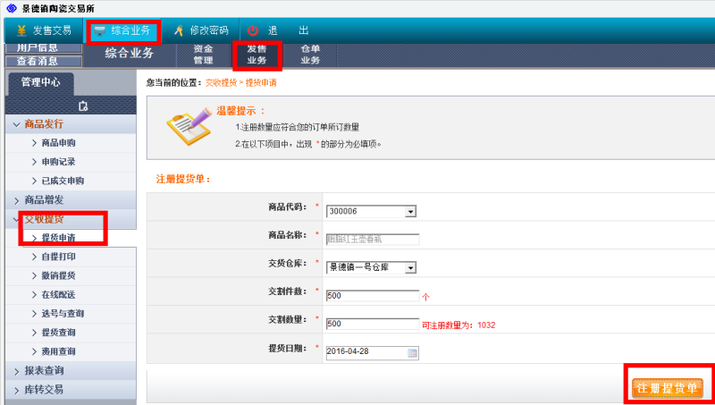 客戶端---綜合業(yè)務(wù)---發(fā)售業(yè)務(wù)---交收提貨---注冊(cè)提貨單