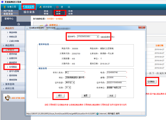 客戶端---綜合業(yè)務(wù)---發(fā)售業(yè)務(wù)---交收提貨---在線配送---在線配送---提交
